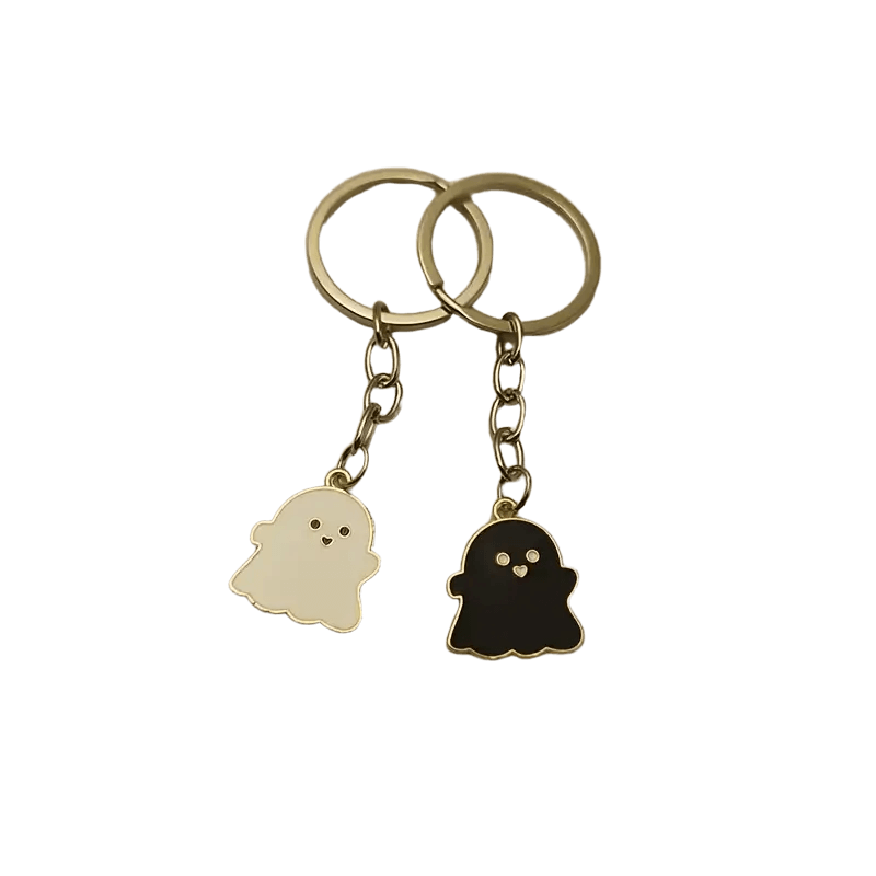 Två små spöken som alltid hör ihop. Setet har en svart och en vit emaljfigur – perfekt för par, bästa vänner eller syskon som vill bära något lekfullt och personligt. Blank finish, skön tyngd och lagom storlek för både nyckelknippa och väska.